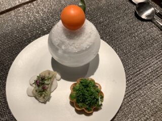 手前右は、菜の花をトッピングしたタラバ蟹のタルト。