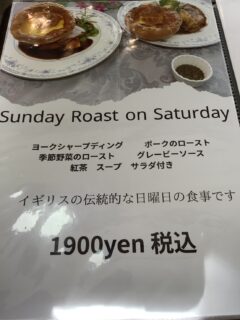 サンデーローストっていうのは、イギリスの日曜日の定番ランチで、肉のローストとヨークシャープディング、マッシュポテトなどをワンプレートで供するのが特徴らしい。